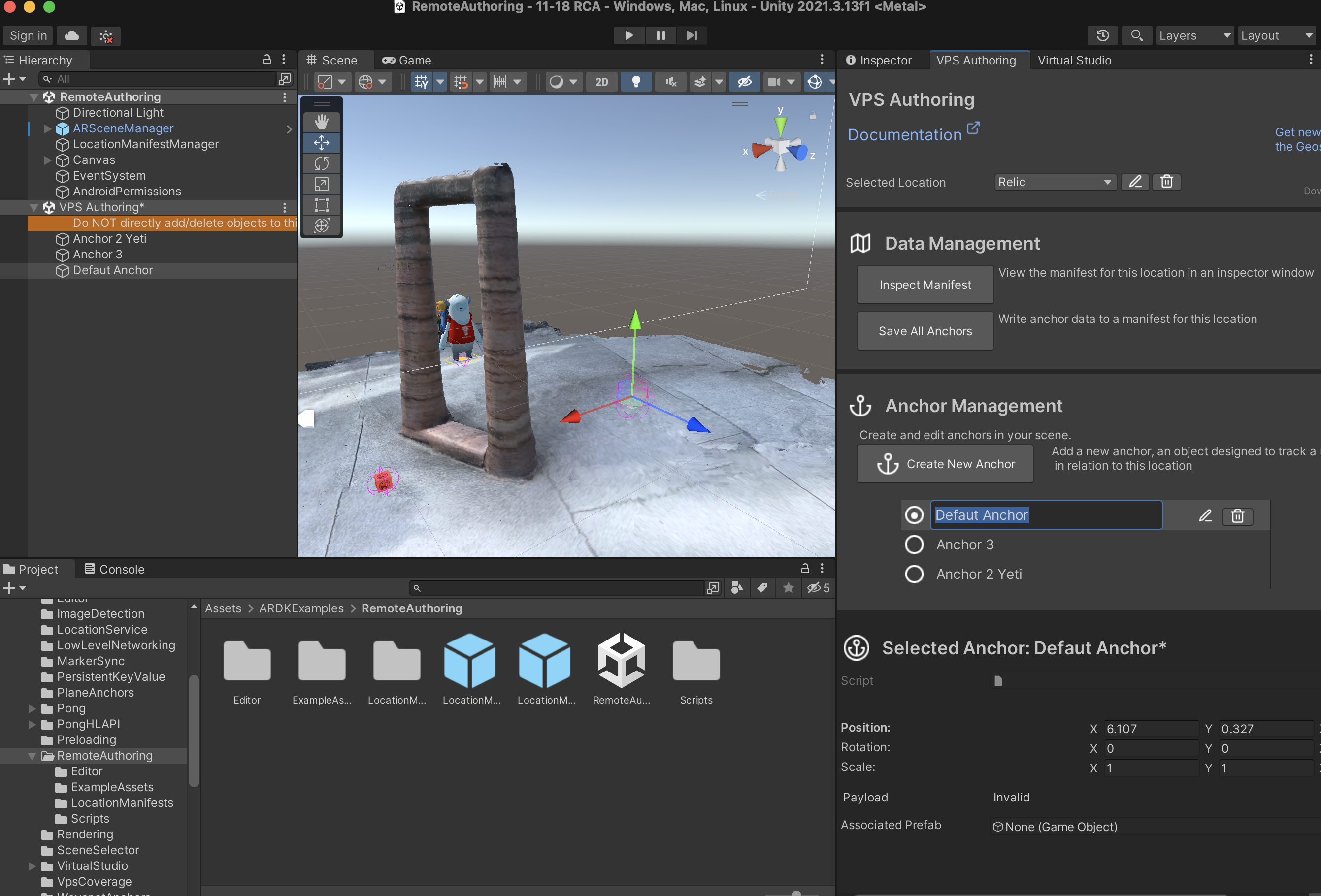 You should not try to create these game objects manually. DO NOT USE Unity’s built-in Duplicate function on anchor game objects. You must use the VPS Assistant Menu to Create, Delete, and Save anchor content.